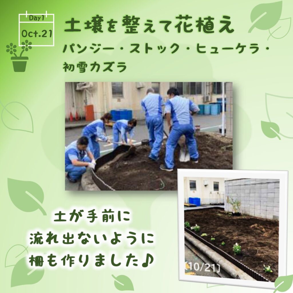 工場内の休憩室をリニューアルしたことがきっかけで、そこから見える屋外の緑地帯も生まれ変わらせたい!と、職員の意欲が高まったのは今年の春先でした。
