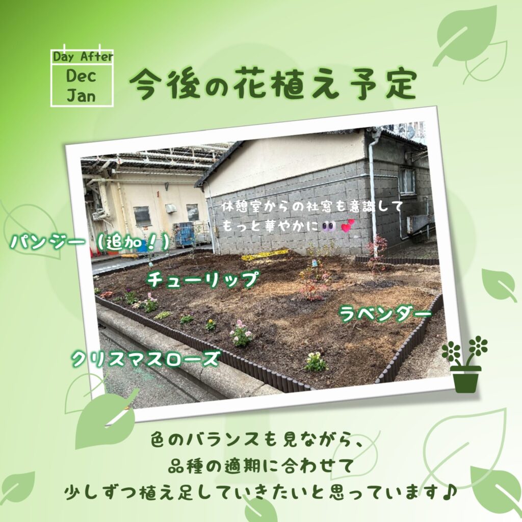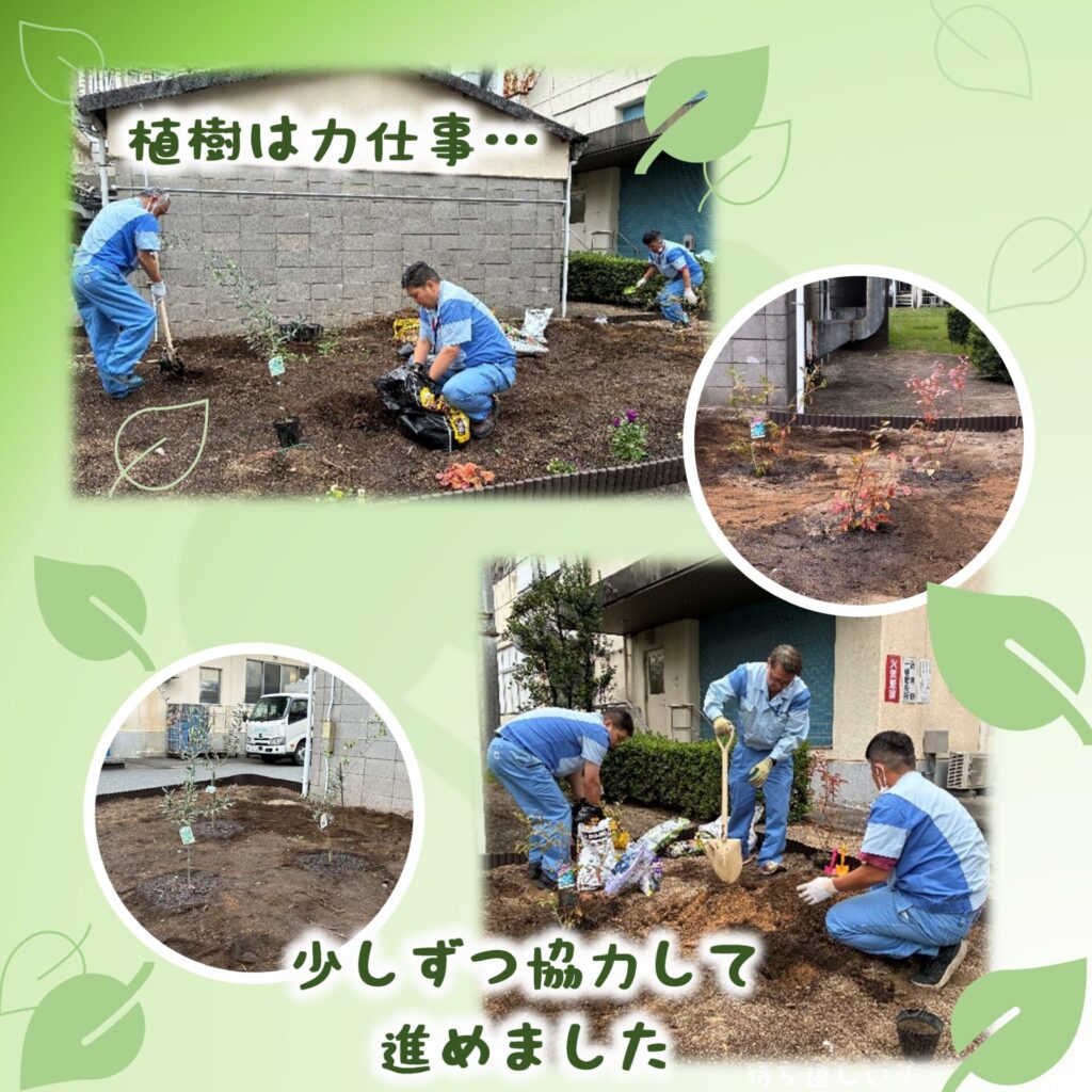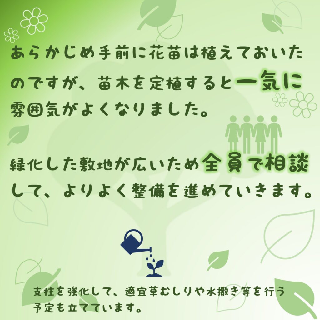維持管理は簡単なことではありませんが、和気あいあい楽しく作業を続け、職員みんなの憩いの時間・空間を作っていきます。