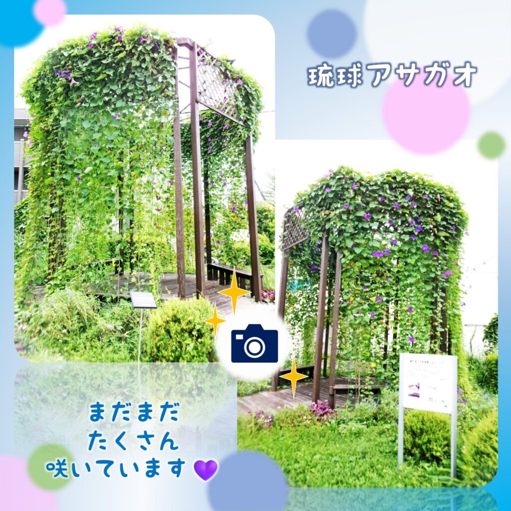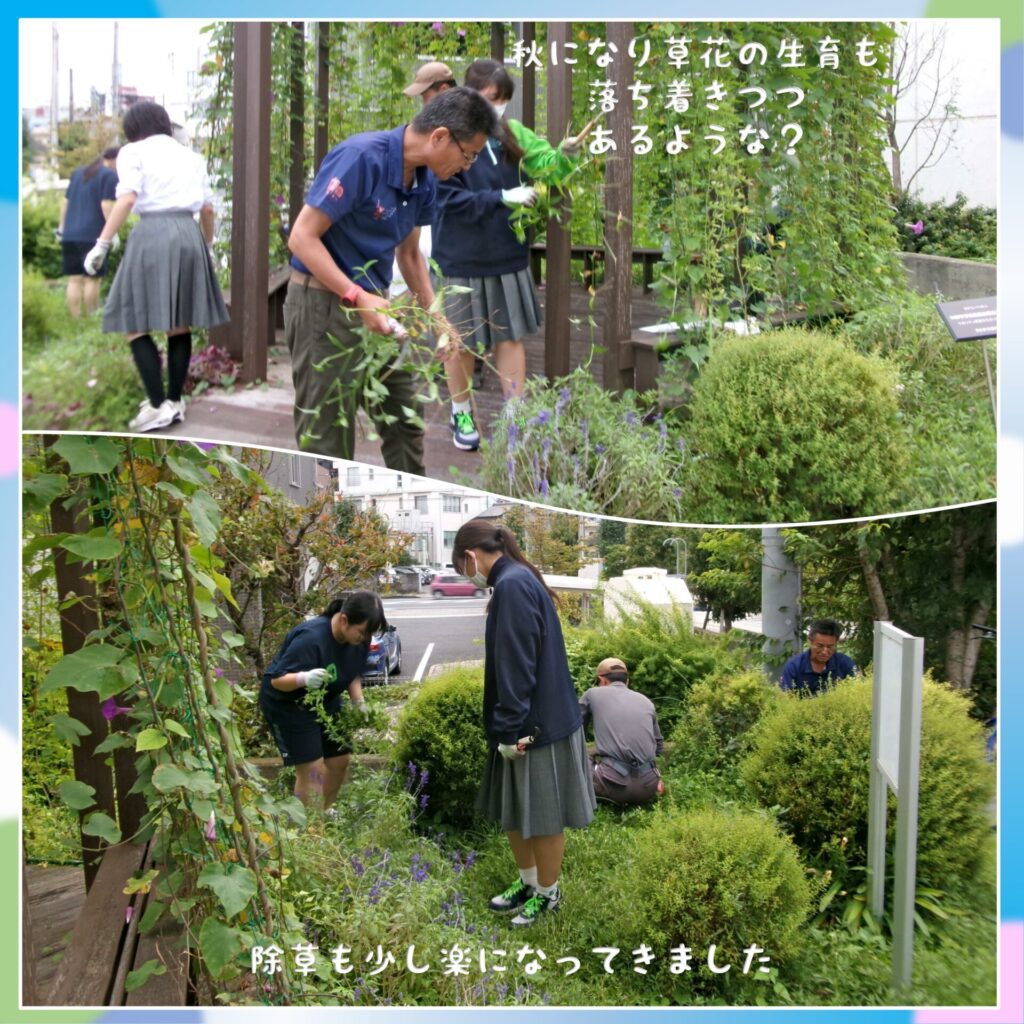 9月下旬でもまだ夏のような気温の日が多かったものの、この日は放課後の部活動(16時以降)かつ曇で比較的涼しく、作業には快適な環境でした。パーゴラは琉球アサガオの生育がまだまだ旺盛で、緑が心地よい空間を保っています。一方でフウセンカズラの種がたくさんなっており、近づく秋の気配も感じることができます。