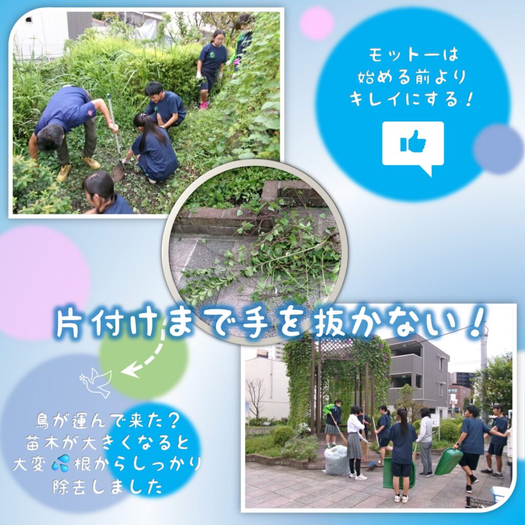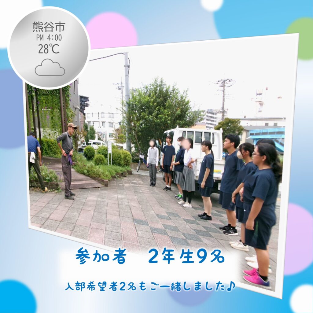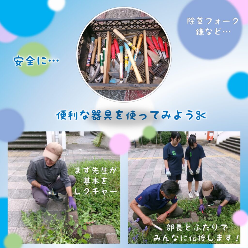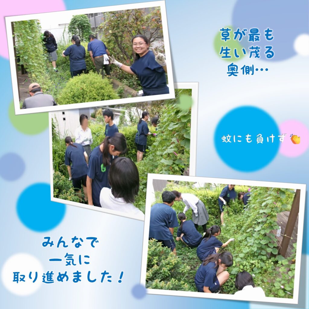 3年生はあいにく学校の用事で来られませんでしたが、入部希望者も含めて計9名の2年生が参加!チームワークよく、短い時間で効率的に除草を進めることができました。