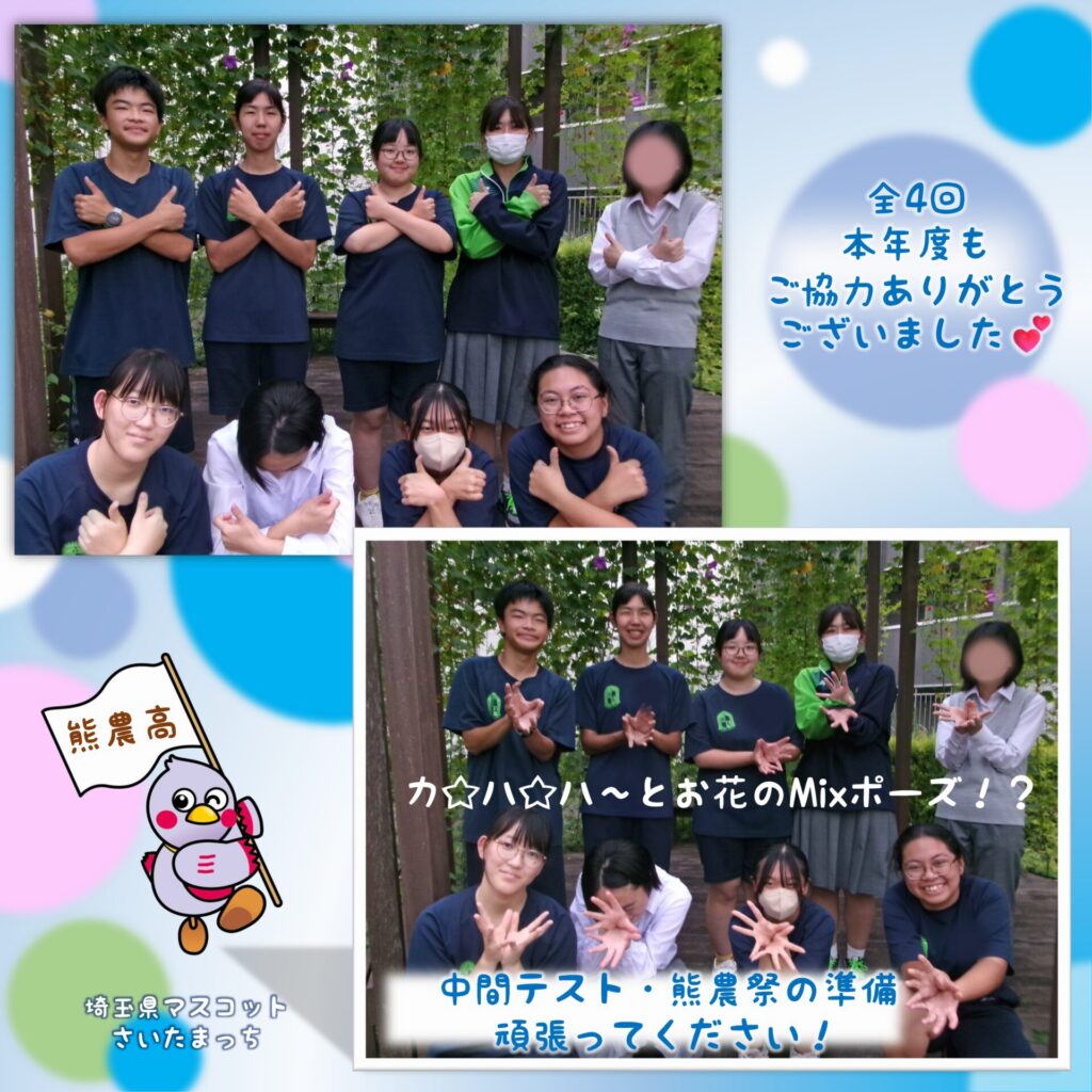 熊谷農業高等学校ガーデニング部の皆さん、春から夏にかけての最も暑い時期に、多大なご協力を本当にありがとうございました。おかげで本年度も皆さんと一緒に、いつも明るく楽しい気持ちで作業ができました。来年度もまたどうかよろしくお願いいたします。