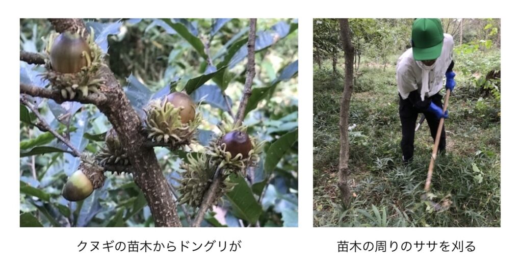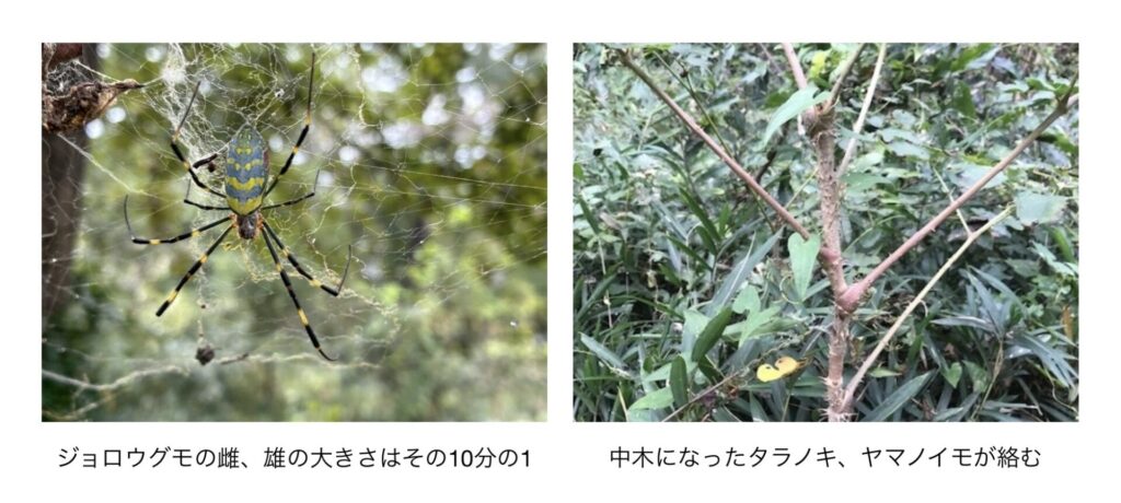 足を踏み入れて中に入り、木と木の間を通ると、ジョロウグモの巣が頭に絡みつきます。一番驚いたのは、中腹で植えたクヌギの苗木がすでにドングリを実らせていることでした。成長が早いのにはびっくりします。クヌギは2年経って実るので、すでに昨年は実が生っていたはずです。コナラ、クヌギなどの広葉樹は成長が早いので、適度に伐採しないと下層が暗くなって行きます。