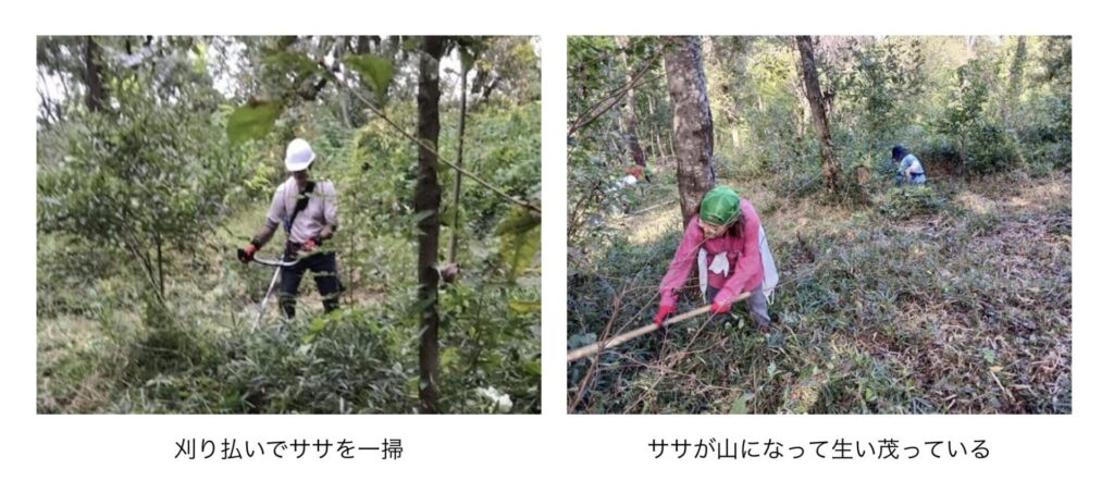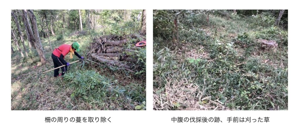 台風の影響で、降ったり晴れたりの繰り返しの日々ですが、今日は晴れで、暖かい日でした。今回は、前回草が多過ぎて下刈りを大分やり残したところでの挑戦です。最初の植栽地を見上げると、苗木は10メートル近く伸び、うっそうとした森になっています。そのため、下層は日が当たらず暗いので、草はほとんど伸びていません。以前、幹の根元近くで折れてつっかえ棒で支えた枝は、完全にくっ付いてたくましく伸びています。クリの木は大きなイガがはじけて実は落ちていました。