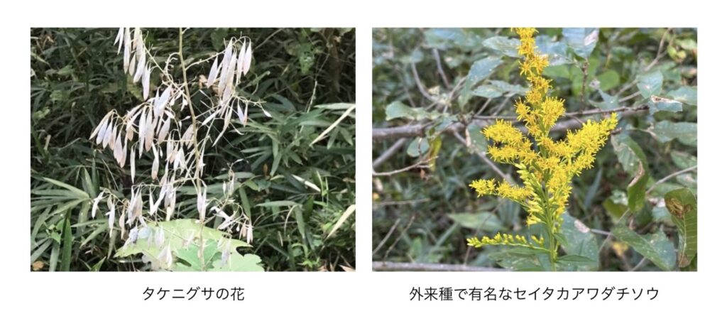 タラノキが中木になって成長していました。このような実の生る木、エゴノキ、クワ、ヌルデ、リョウブなどは残すことが必要と感じます。下刈りの時、これらの幼木は気が付かず、刈ってしまいがちなので、もう一度念入りに調べて印をつけること。こんな小さな地域でもたくさんの種類の樹木が育っています。それに頼って昆虫もやってきます。また、外来種として有名なタケニグサの花やセイタカアワダチソウが珍しく目につきました。これらも花がない時は非常にきれいに感じられます。