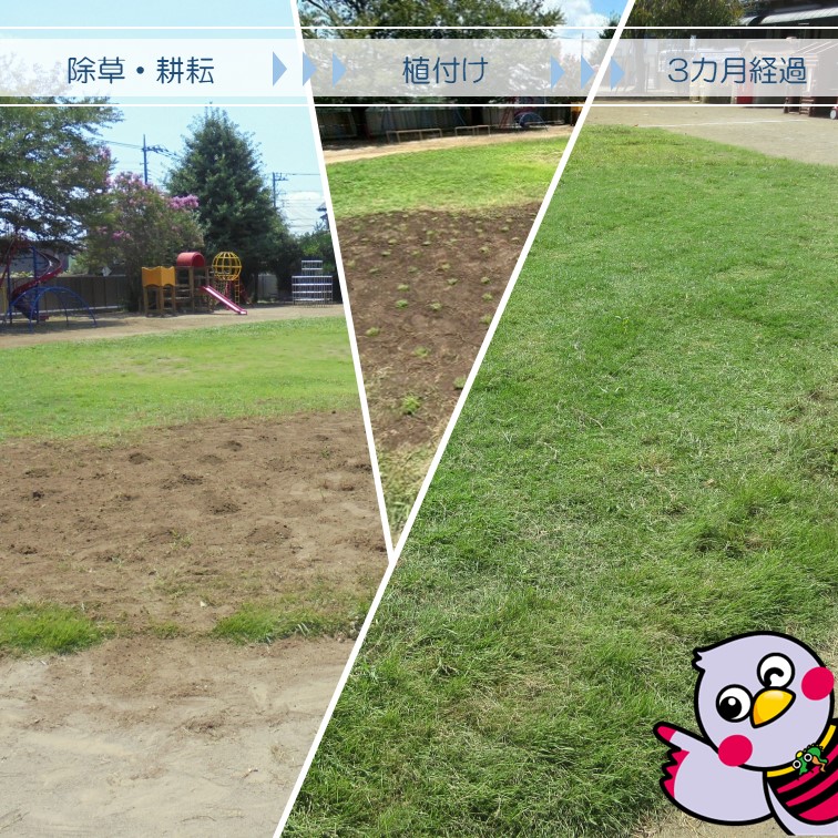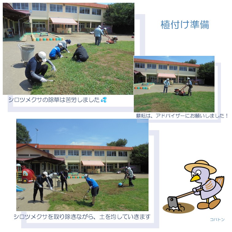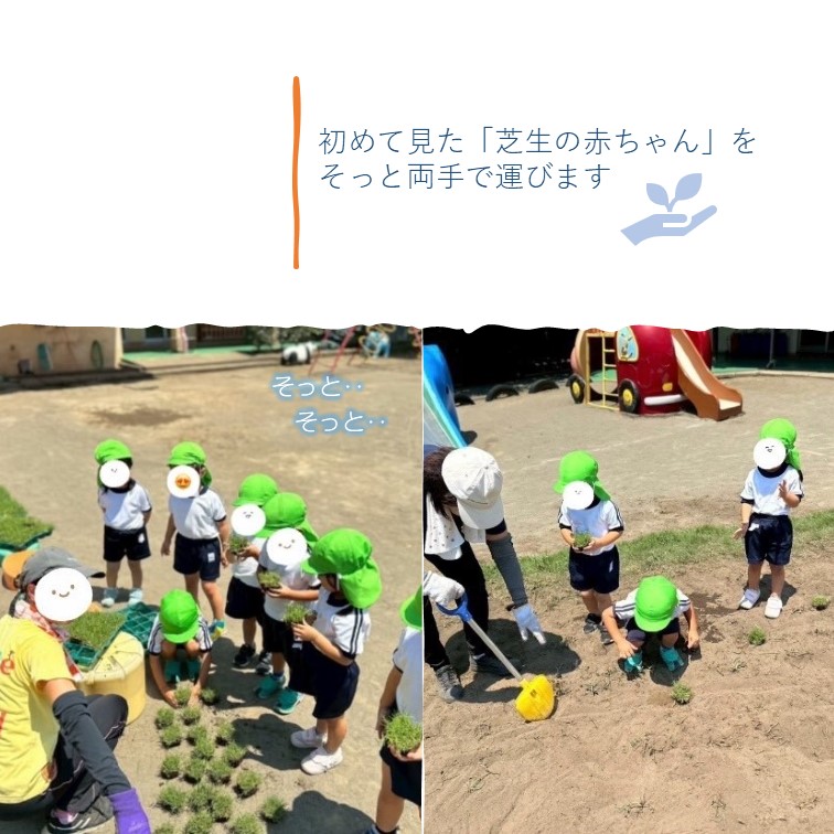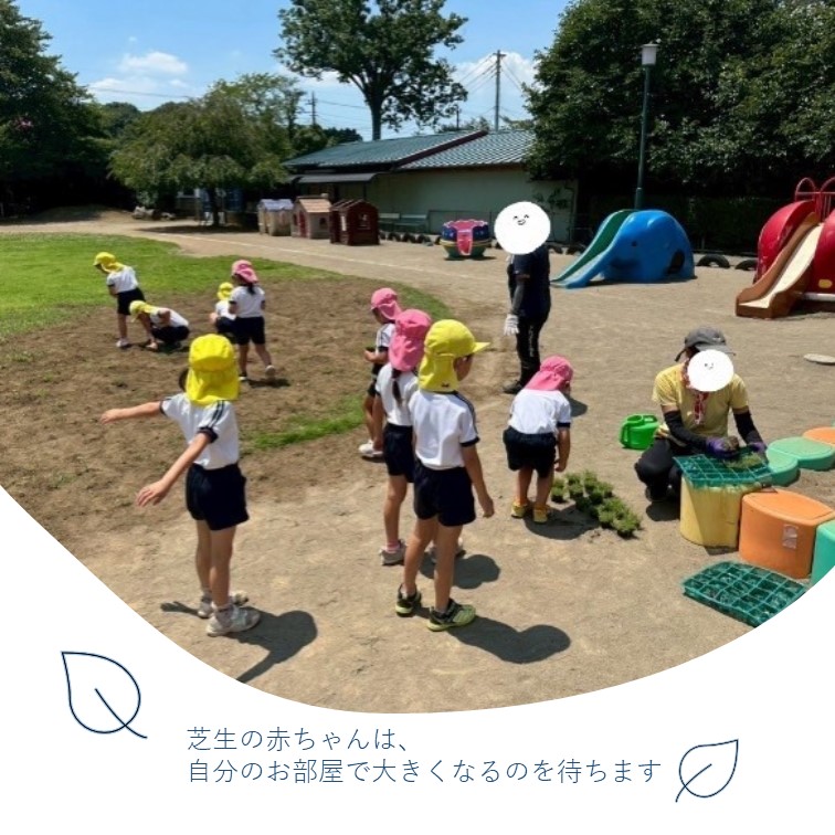 ▼感想 大変暑い日だったが、アドバイザーとみどり自然課の方に教えていただきながら、園児と共に楽しく植えることができた。芝生がすくすく育つことを想像しながら、毎日の水やり等をみんなで協力しながら育てていきたいと思う。子どもたちは芝植えの記念にいただいたルーペを大事そうに持ち帰っていた。 ▼今後の維持管理 朝夕の水やり、立ち入り制限の囲み、シロツメクサ等の草刈り