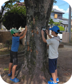 公園入り口付近にある、園内2番目の巨木で、直径60cmのケヤキに、小学生の2人で樹名板を設置しました。
