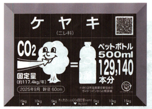 この巨木が吸収するCO2の量を表示したアボック社特注の樹名板です。