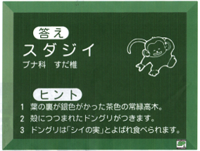 クイズ形式の「これ何の木?」は、子供達に人気のドングリの木から、スダジイを選びました。