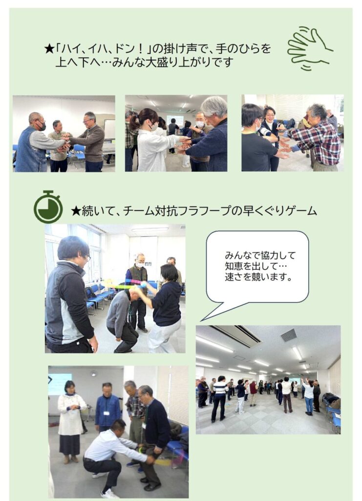 2人一組になって、自己紹介をします。自己紹介といっても、名前と好きなものを一つだけ伝えます。続いて…3人、4人と人数を増やしていきます。皆さんすっかり、笑顔でいっぱいです。