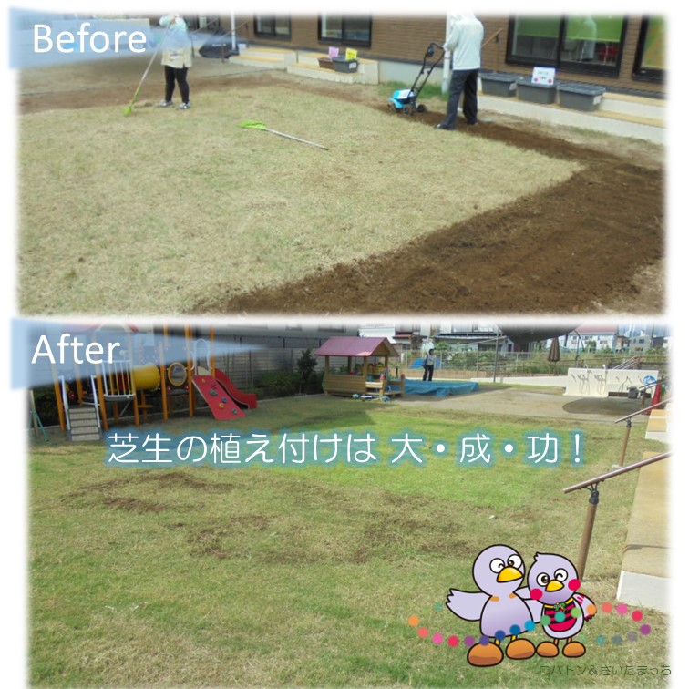 ▼感想 植え付けたポット苗が少しずつ広がっていることに、芝の成長を感じることができ嬉しく思います。肥料やりも行い、芝が成長するよう育てていきたいです。