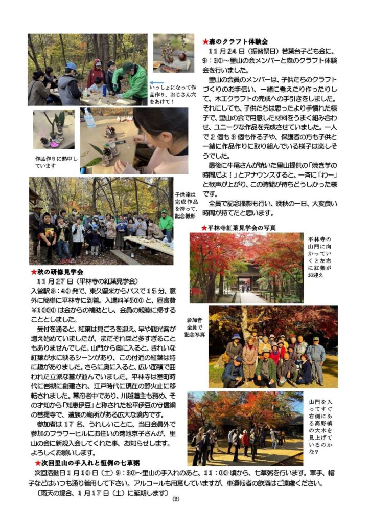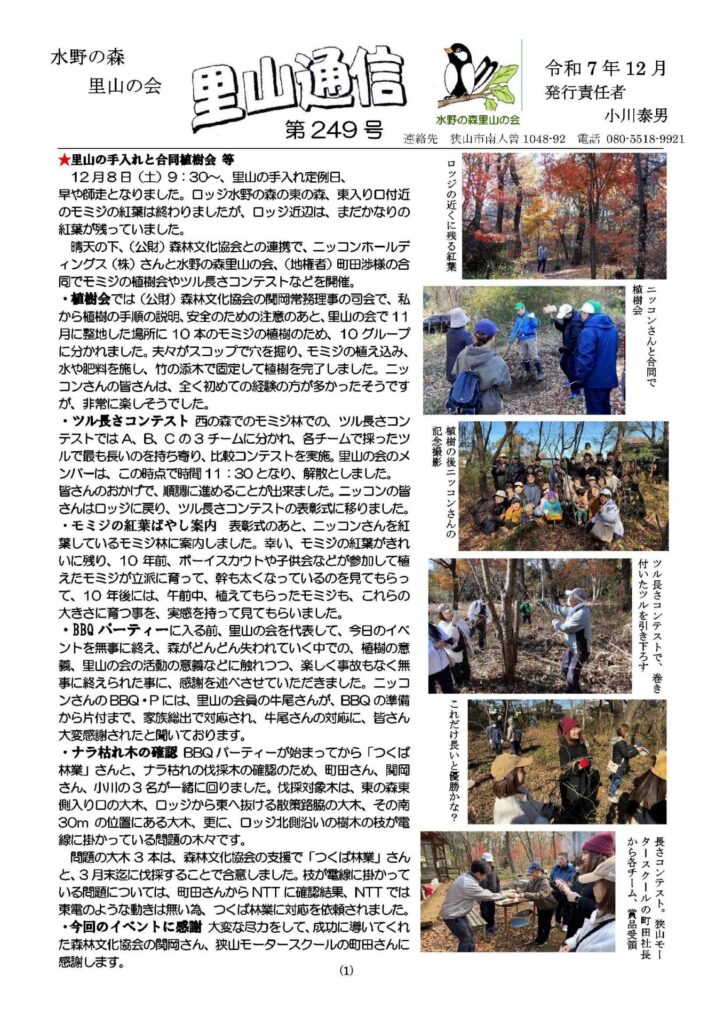 2)里山通信No.249は12月6日の森の手入れイベントに加え、11月24日の子ども会対応の「森のクラフト体験会」、11月27日の「平林寺紅葉見学会」等のイベント活動の掲載もあり、いつもの1頁ではスペースが不足することから、2頁に掲載しました。