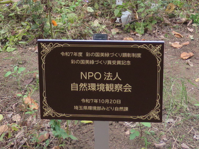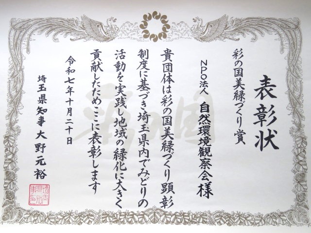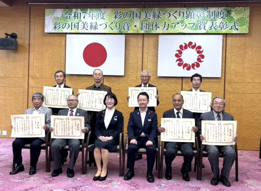 10月20日(月曜日)に知事公館に於いて「彩の国美緑づくり顕彰制度」に基づくみどりの活動を実践し地域の緑化に貢献した団体の表彰式。写真は左から表彰状、副賞、県職員・受賞団体。