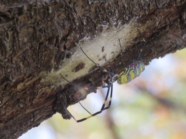 ジョロウグモがスモモ幹に(産卵)