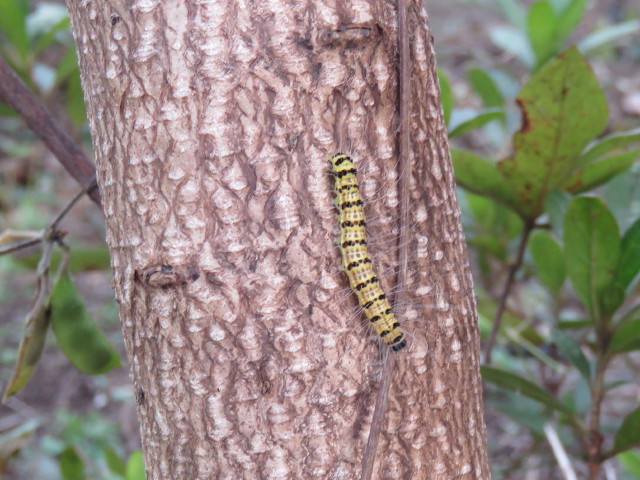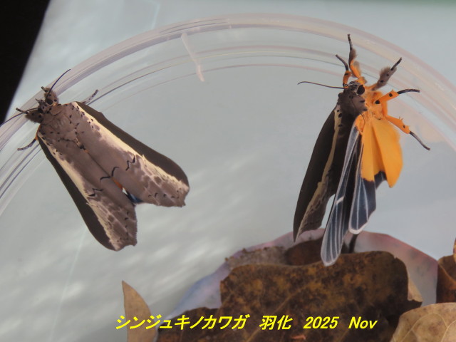11月8日ニガキ科シンジュでシンジュキノカワガ(南方からの飛来性チョウ目コブガ科)の成熟幼虫が降りてきたのを捕獲(写真左)。先月捕獲した蛹(写真中)から11月中旬以降成虫が羽化してきた(写真右)。