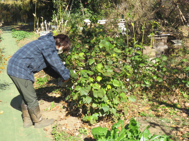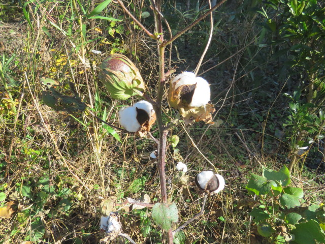 11月20日、26日、28日に桶川オアシスの竹切りとワタの収穫。竹は繁茂してきたマダケを伐採(写真左)。ワタは花が終わり果実後期、多くは綿花期だったので綿花を収穫した(写真中)。果実と綿花(写真右)。