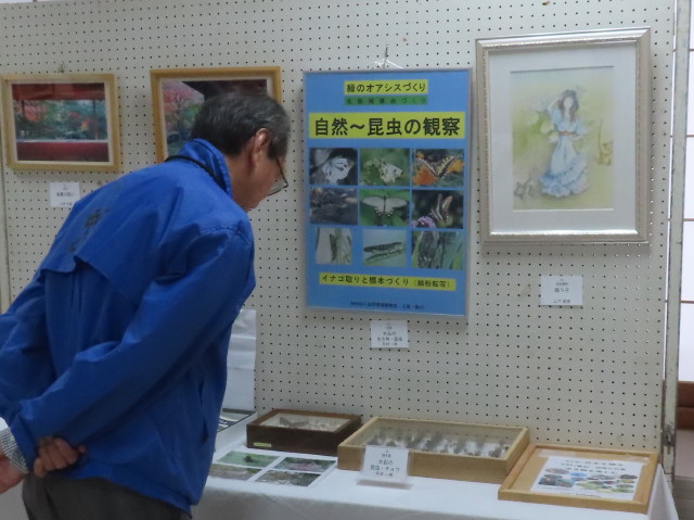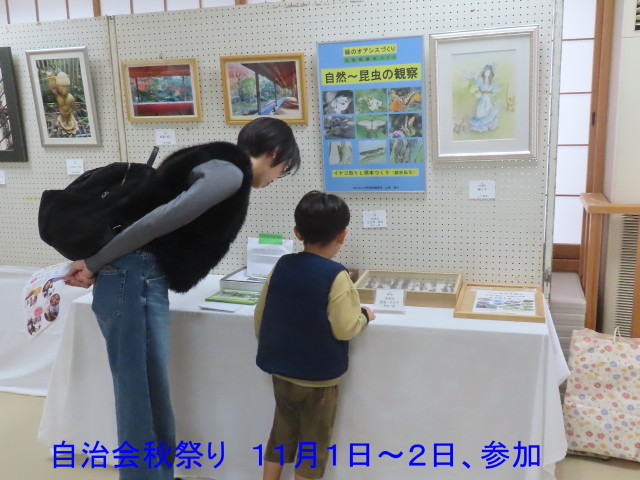 11月1日~2日 自治会主催の上尾中妻記念会館まつりに参加(写真左)。自然と昆虫のテーマで、昆虫鳥パネル、昆虫標本を展示した。地域のまつりだったので知り合い多数が来訪し新たな交流の場になった(写真中、写真右)。