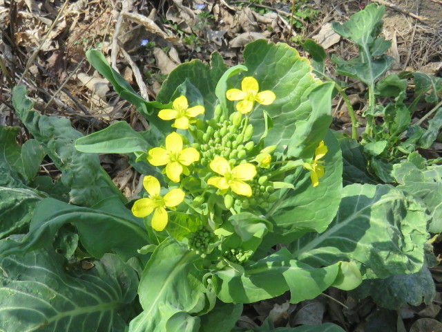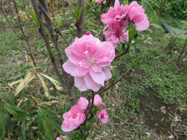 🔷桶川オアシス 日向ではムラサキハナナ、コマツナ、ハナモモ、アンズ、ハクモクレン、サクラは小麦草丈20cm。(開花)