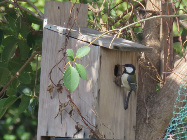 野鳥の観察、上尾桶川オアシスに設置した巣箱にシジュウカラが箱板をコンコン突き、内検に来た(写真左)。桶川オアシスの綾瀬川上流域でキセキレイ(写真中)、近くの樹林内でヤマガラがエゴの実を探索する姿を観察した(写真右)。キジも観察した。