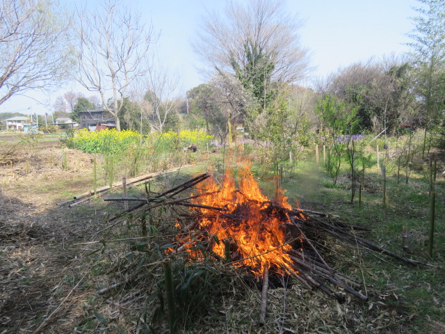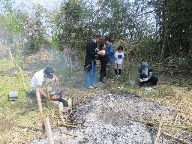 春恒例の焼き芋大会、前年伐採のマダケを燃やして焼き芋熱源準備(写真左)、焼き灰の上にサツマイモ、ジャガイモを置いてさらに焚き火、30分後に完成(写真中)。その後キクイモの植え付け(写真右)。