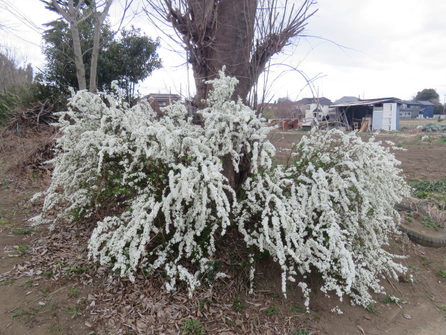 桶川オアシスでは花は2月に続きショカツサイ咲続き(写真左)、後半には満開。ヒラタアブ、クマバチ、アゲハ、シロチョウなどが吸蜜に飛来。コマツナも花期に入る(写真中)。ユキヤナギは満開(写真右)、テントウムシ、アゲハが集まった。