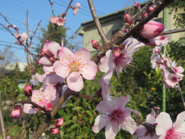 小梅・白梅(青梅肥大中)シダレザクラ、アーモンド(開花)