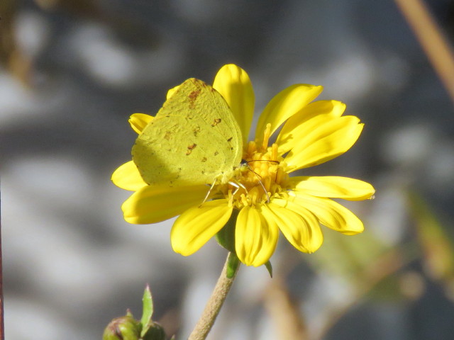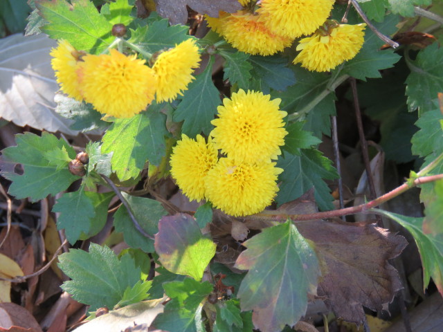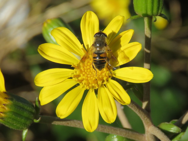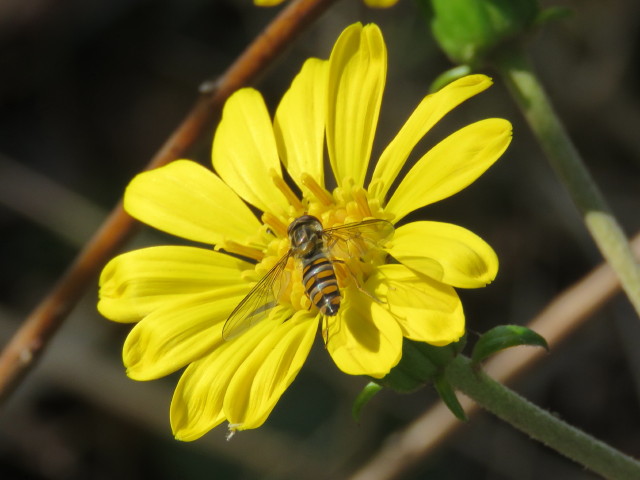 12月7日、桶川オアシスでツワブキの花にヒラタアブ(写真左)、キタキチョウ(写真中)、ナミアブ(写真右)が飛来し吸蜜した。