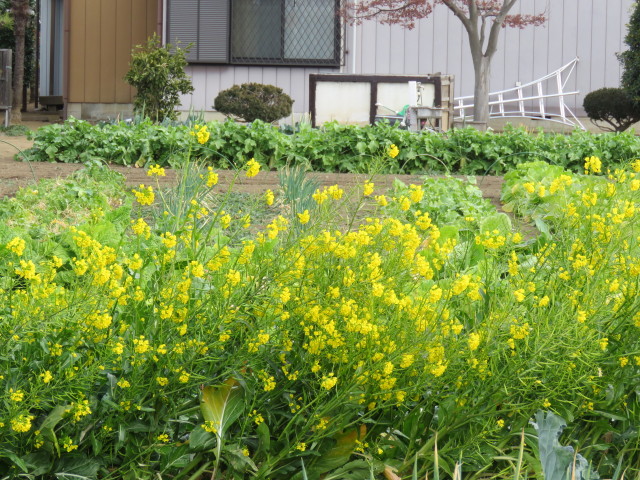 ハルジオン、ムラサキハナナ、ニンニク、ダイコン、コマツナ、小麦(出芽)