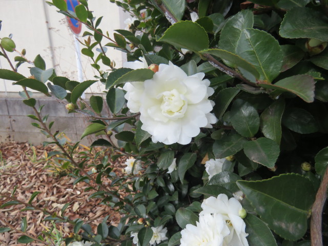 12月30日、上尾オアシスで早生白梅咲く(写真左)、寒菊(写真中)、山茶花咲く(写真右)