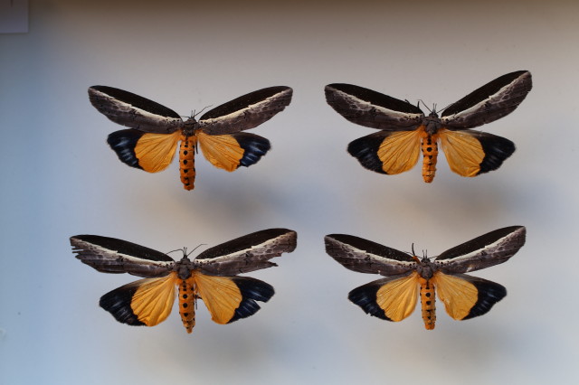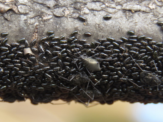 桶川オアシス~上尾オアシス、温暖気流に乗って(飛ばされて)、シンジュに来たと思われる南方系長距離飛来性昆虫(シンジュキノカワガ)が10月後半から蛹化、11月後半に羽化した。それを12月に展翅した(写真左)。先月まで上尾オアシスのトウネズミモチの幹に大集合していたツヤアオカメムシがレタスなど葉菜類の葉間で越冬(写真中)。上尾オアシス、12月からクリの古木に産卵し始めたクリオオアブラムシが卵態で越冬に入った(写真右)。