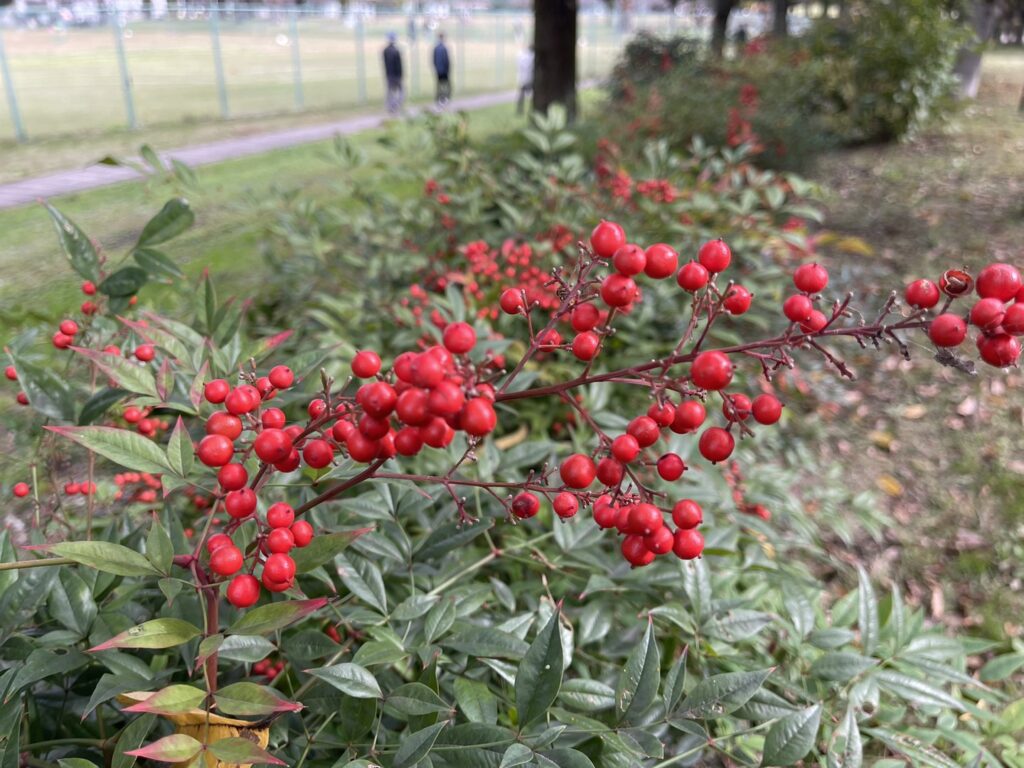 真っ赤なナンテンの実が公園のお散歩道を彩ります🍁