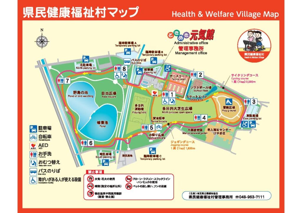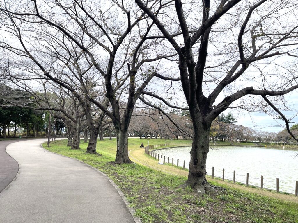 公園には、一周約1.8kmのジョギングコースとウォーキングコース、その外周には約2kmのサイクリングコースがあります。