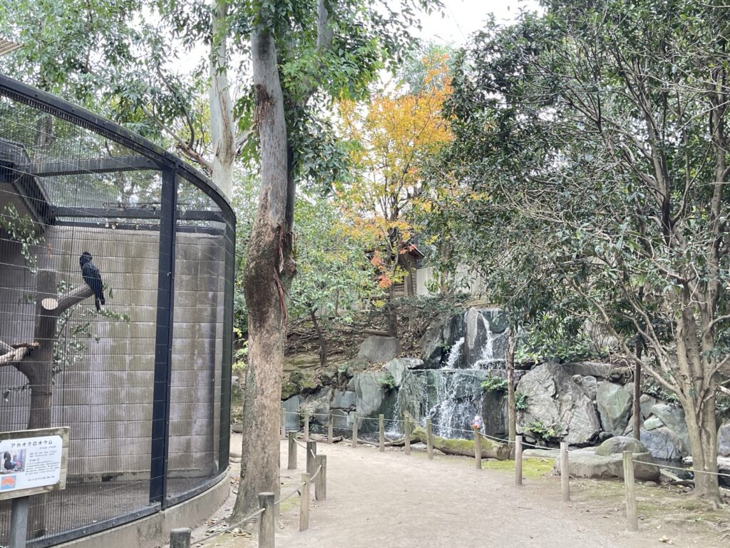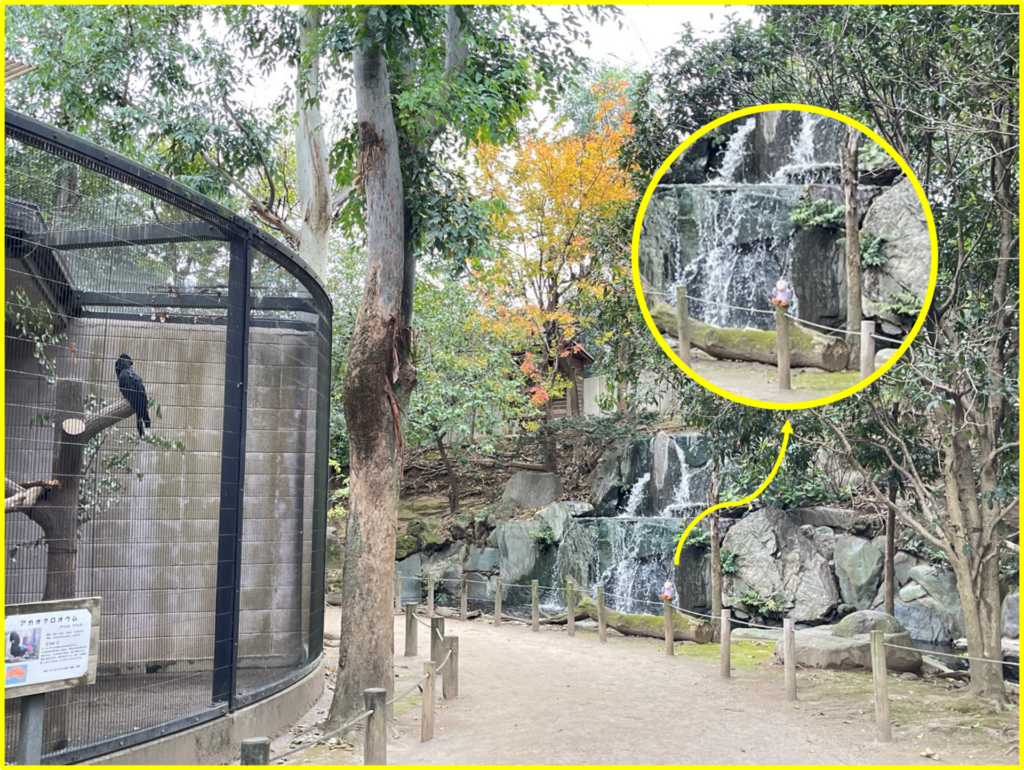 コバトンがどこかにいるよ。わかるかな?オーストラリアの自然を再現している森の中には滝があり、川が流れているよ。