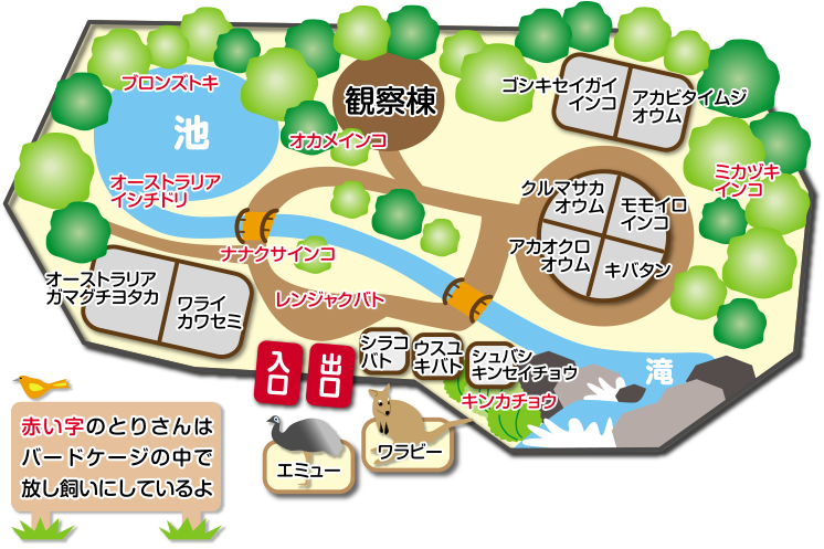 メインである約3,000平方メートルのバードケージの中では、オーストラリアのキャンベルタウン市から寄贈されたオウム類のキバタンやクルマサカオウム、オカメインコなどを観察することができます。その他、ワラビーの仲間であるアカクビワラビー、エミューのエリアもあります✨