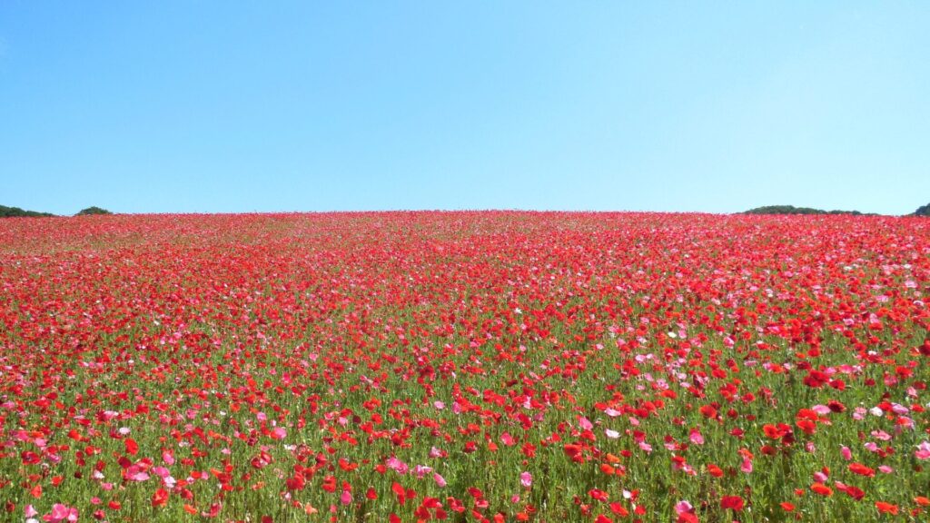 一面に広がるポピーと、澄み渡る青空とのコントラストは絶景です。
