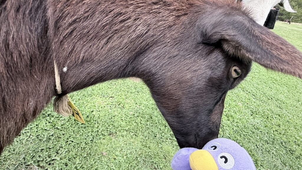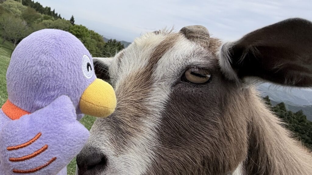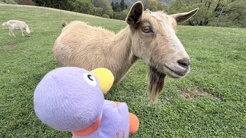 ヤギたちと一緒に遊んでいるコバトン。どこにいるかわかるかな?