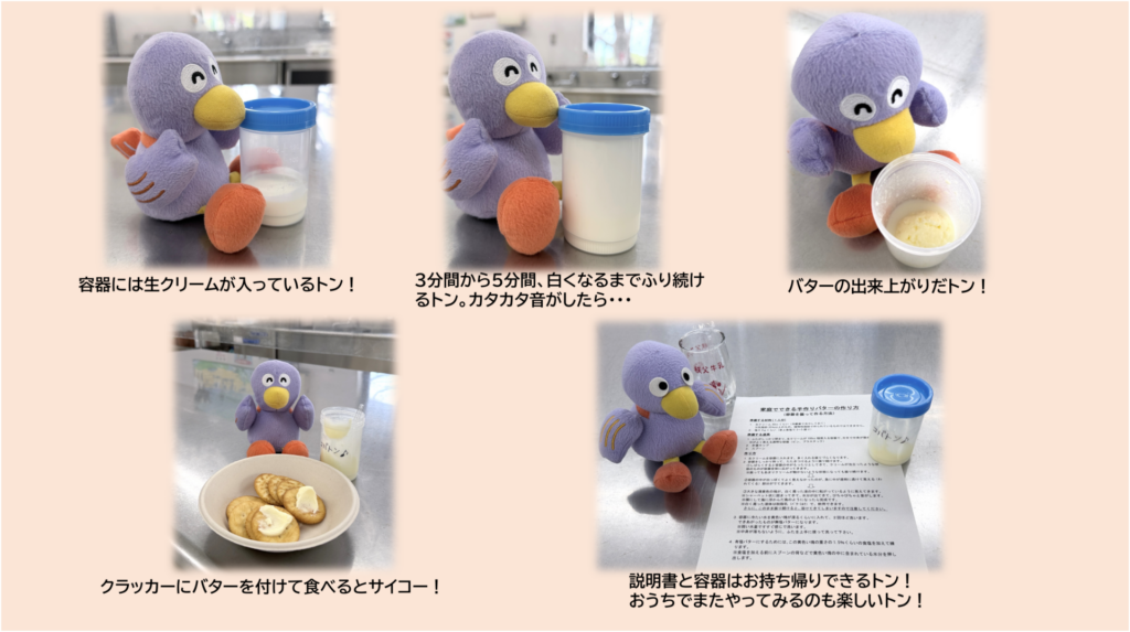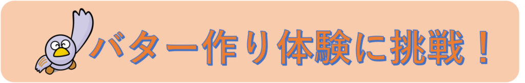 土日、祝日には、乳製品の手作り体験も行っています。一人150円の参加費で、アイスクリームやバター等、手作り体験ができます。季節によって変わり、コバトンが訪れた日は、バターの日。さっそく挑戦します💪🏻