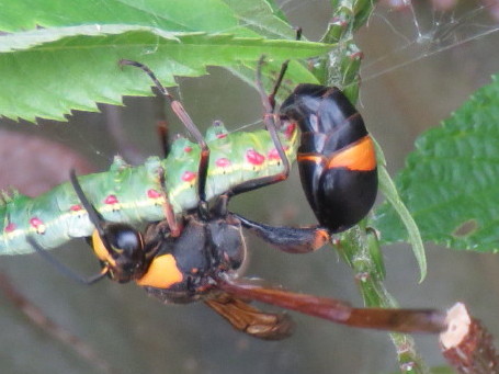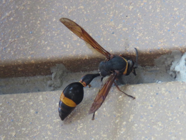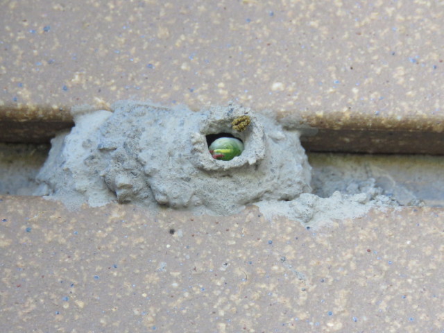 今年の9月、上尾オアシスでスズメバチを平年より多く観察した。壁面に巣づくりをし、幼虫の餌になるガの幼虫を捕獲し麻酔して巣に運び込む。そして巣にふたをしてスズバチ幼虫が発育するのを待つ。10月上旬まで新成蜂は出てこなかった。来春に出て来るのだろう。