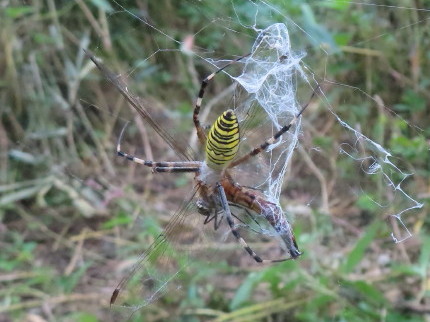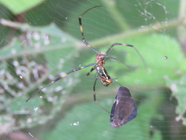桶川オアシスの雑木林に張られたナガコガネグモとその巣にかかったアキアカネ、およびジョロウグモの網にかかって捕食されたチュウゴクアミガサハゴロモ。