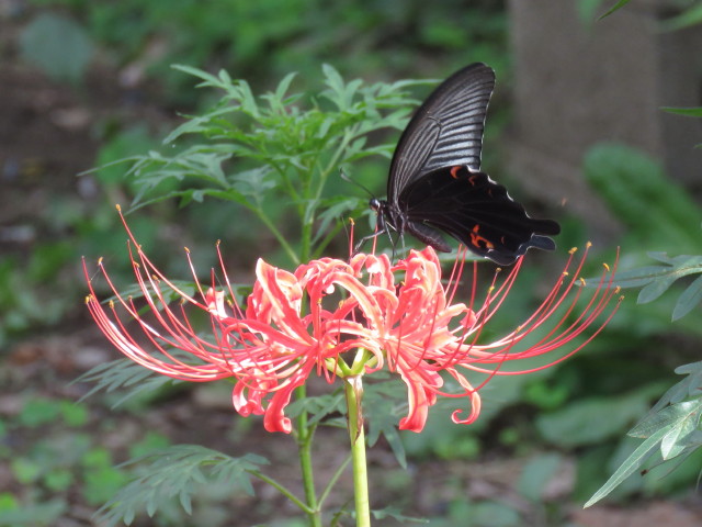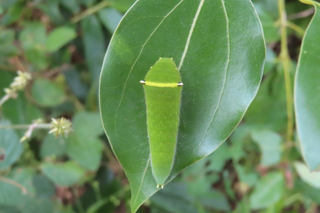 桶川オアシスで開花したヒガンバナに吸蜜に来たクロアゲハ。早咲きの黄色系ヒガンバナは花期長く10月上旬まで満開株もあり、両花色が混生していた。緑色の成熟幼虫はタブノキで生育していたアオスジアゲハの幼虫。その他アゲハの成幼虫、ジャコウアゲハの成幼虫、ナガサキアゲハの成虫も見られた。