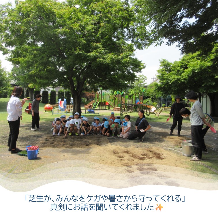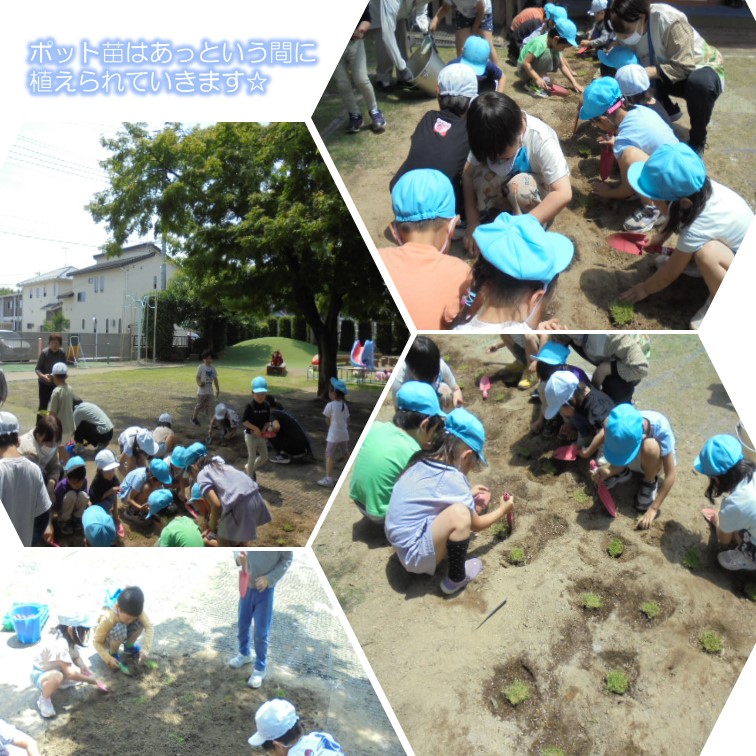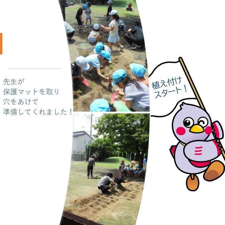 ▼感想 年長児は積極的に芝を植え、土をかぶせることを喜んでやっていた。100個のポット苗の植え付けは時間がかかるかなと思っていたが、あっという間に終了となった。ありがとうございました。