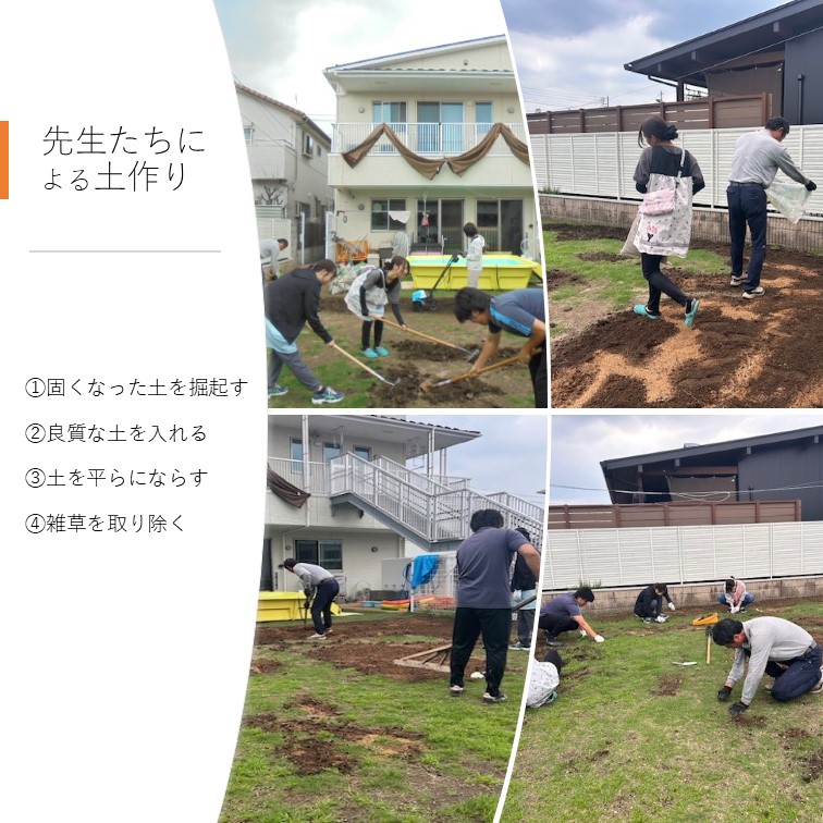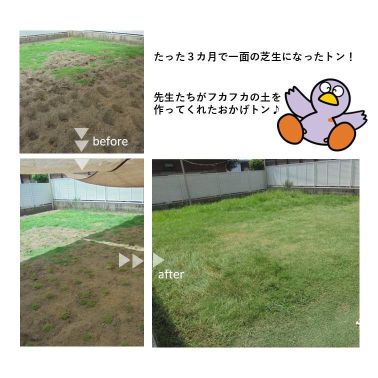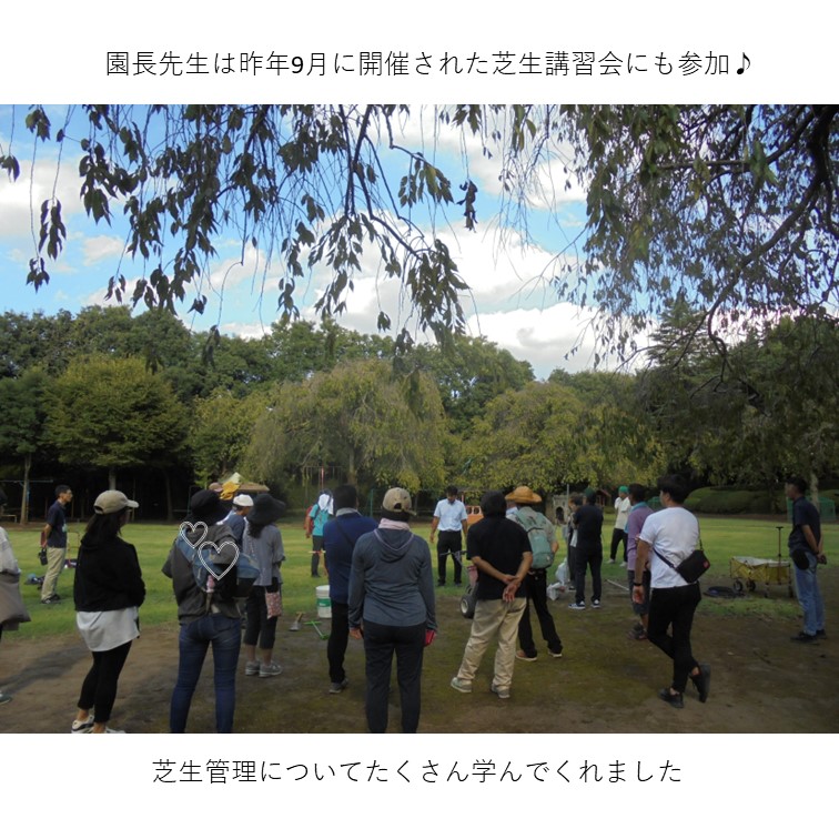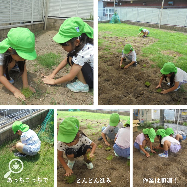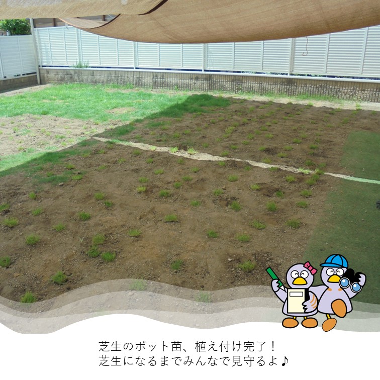 ▼感想 (みどりのアドバイザーやみどり自然課職員が)作業を一緒に行っていただいた事で、子どもたちも楽しみながら学び、活動ができた。子どもや職員で開所当初のように綺麗な芝生で園庭を埋められるよう、手入れをしていきたい。 ▼今後の維持管理 朝夕の水やりの徹底や雑草抜き、芝刈りを行う。 また、状況によりエアレーション等の土の管理も行う。