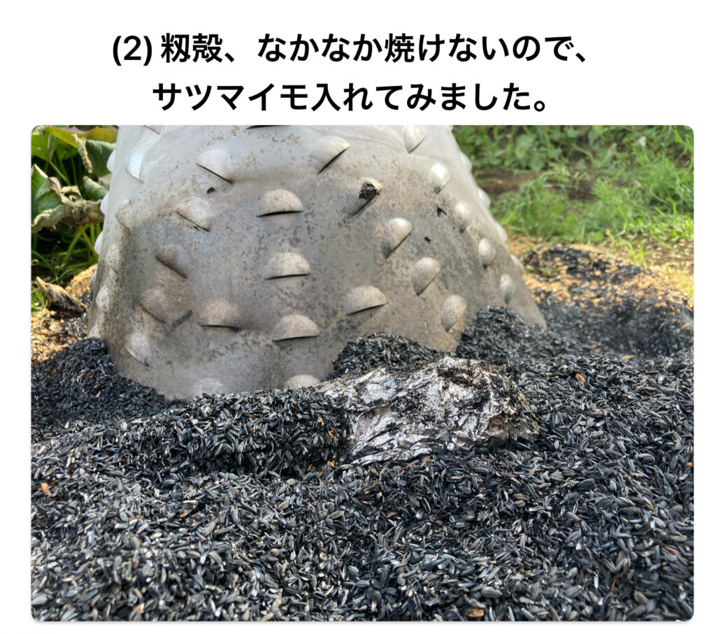循環型農法(じゅんかんがたのうほう※1)の一環として、 籾殻燻炭(もみがらくんたん※2)作りにトライしました。