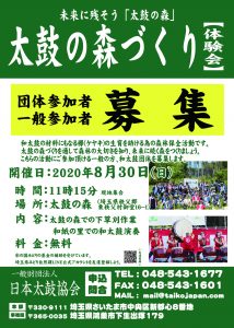 一般財団法人日本太鼓協会では平成22年9月より埼玉県東秩父村にて「太鼓の森づくり」と称し、ケヤキの植樹、育成、保全活動を年2回行っております。この維持管理を行う事で地域とのふれあいや絆を深める事を目標にしております。