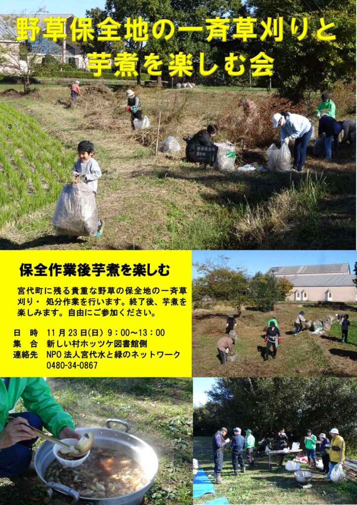 宮代町に残る貴重な野草の保全地の一斉草刈り作業を行います。終了後、芋煮を楽しみます✨