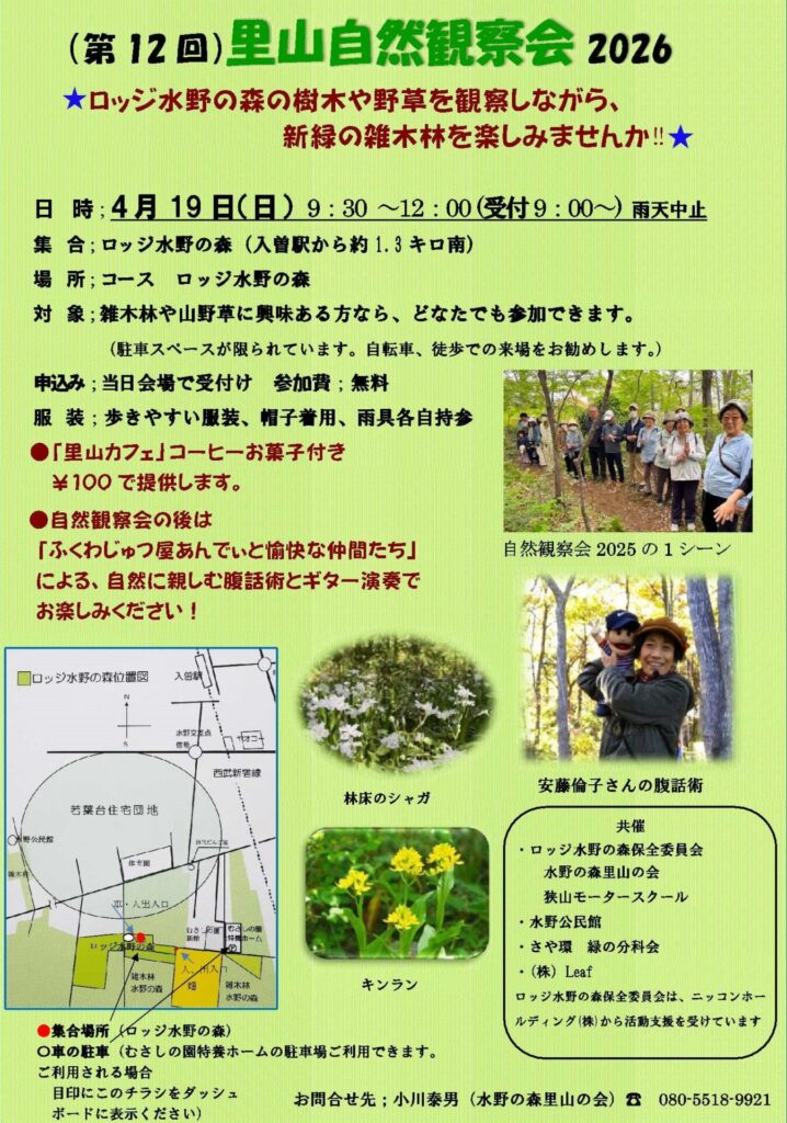ロッジ水野の森の樹木や野草を観察しながら、新緑の雑木林を楽しみませんか🌳 雑木林や山野草に興味ある方なら、どなたでも参加できます😊 自然観察会の後は「ふくわじゅつ屋あんでぃと愉快な仲間たち」による、自然に親しむ腹話術とギター演奏で お楽しみください🎵✨