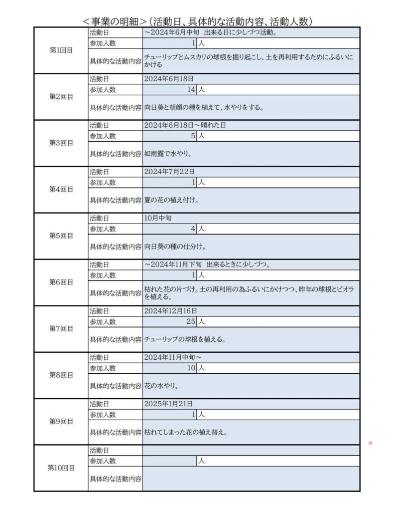 <事業の詳細>(活動日、具体的な活動内容、活動人数)