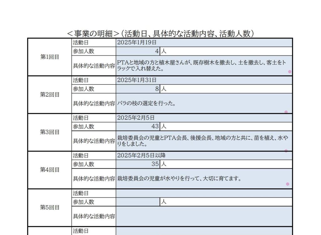 <事業の詳細>(活動日、具体的な活動内容、活動人数)