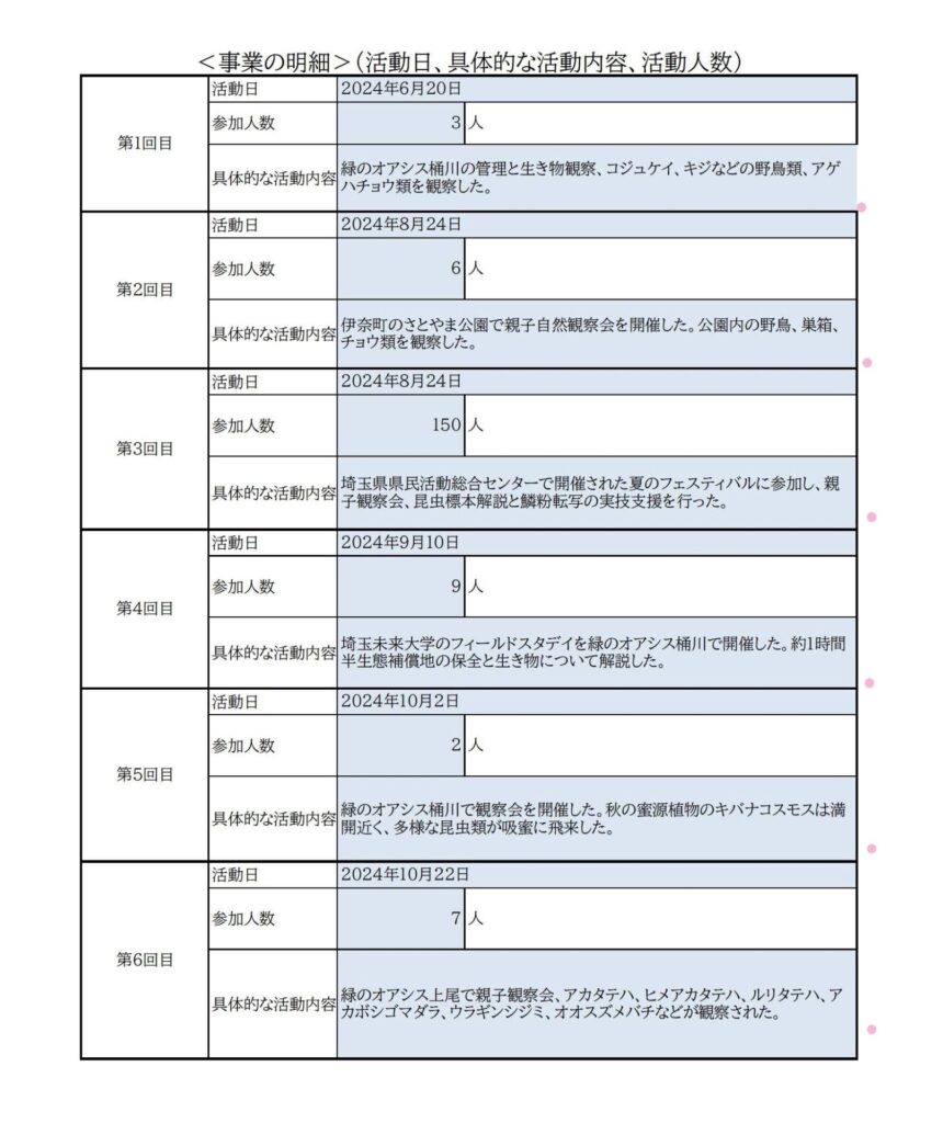 <事業の詳細>(活動日、具体的な活動内容、活動人数)