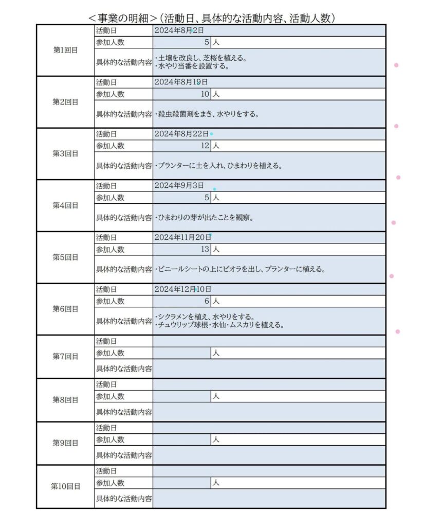 <事業の詳細>(活動日、具体的な活動内容、活動人数)
