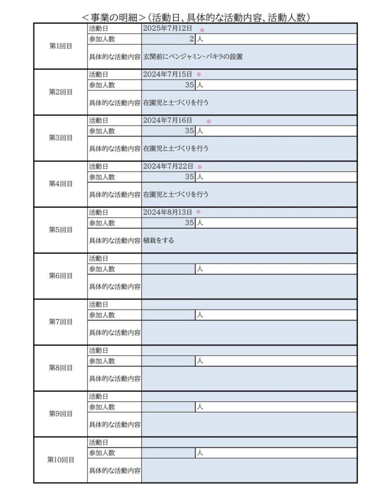 <事業の詳細>(活動日、具体的な活動内容、活動人数)